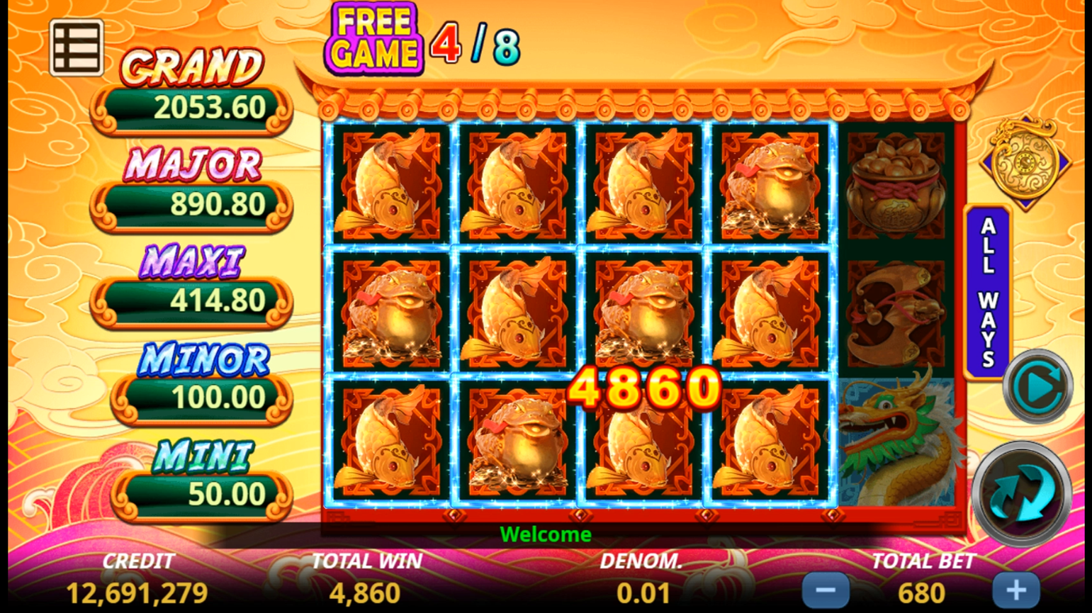Introduction 5 reels and 243 lines slot game.Have chance to win multi-jackpot in one BONUS GAME. Free play